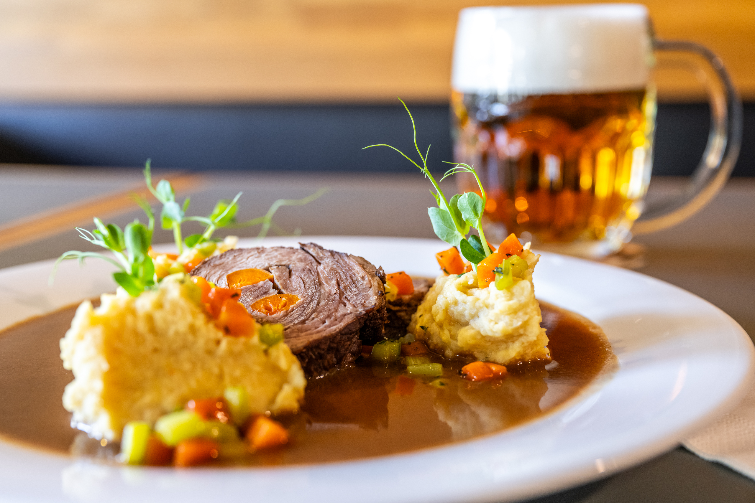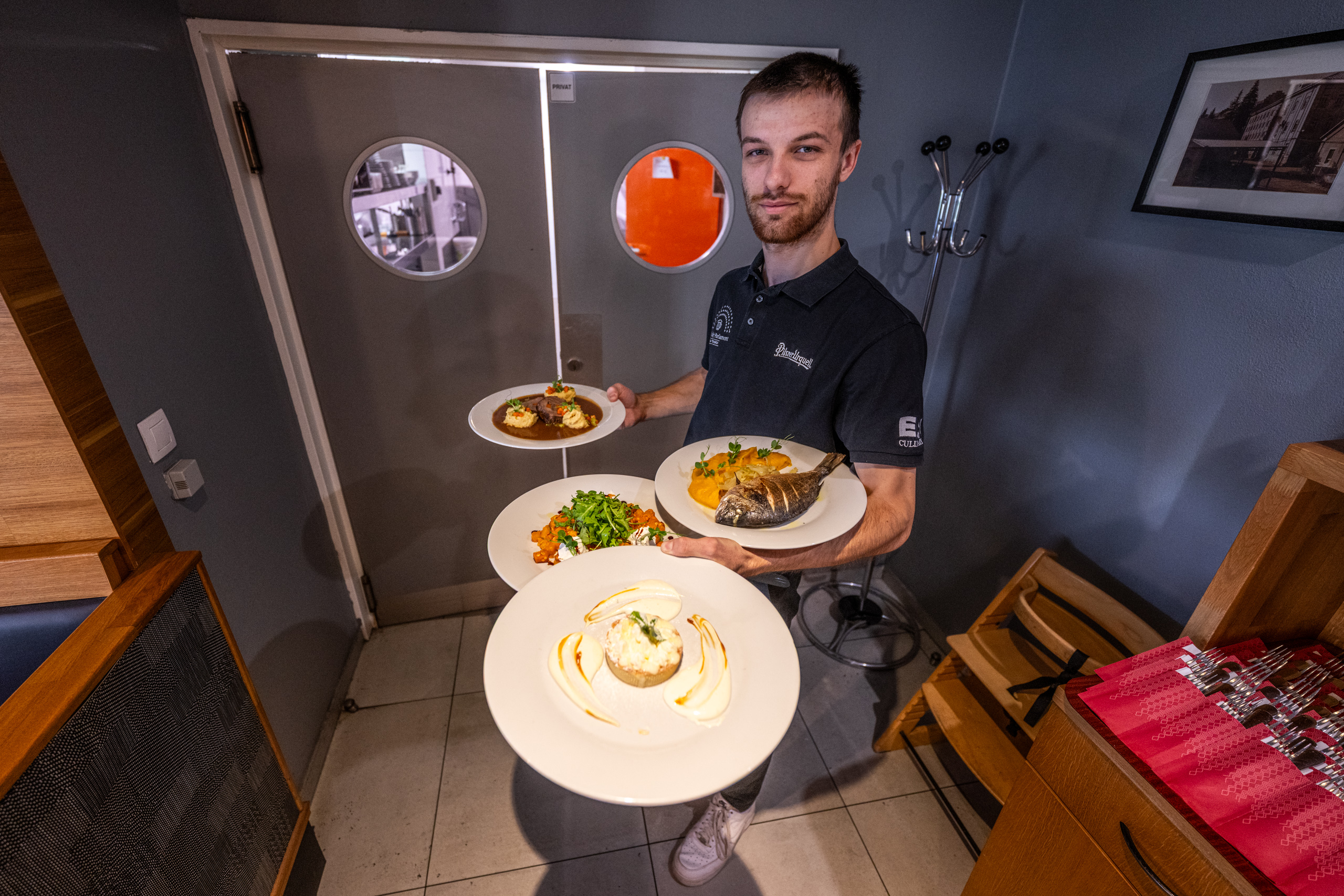 Nabídka zahrnuje polední business menu i plnohodnotný stálý jídelní lístek s moderně pojatými klasickými recepty z regionálních surovin.