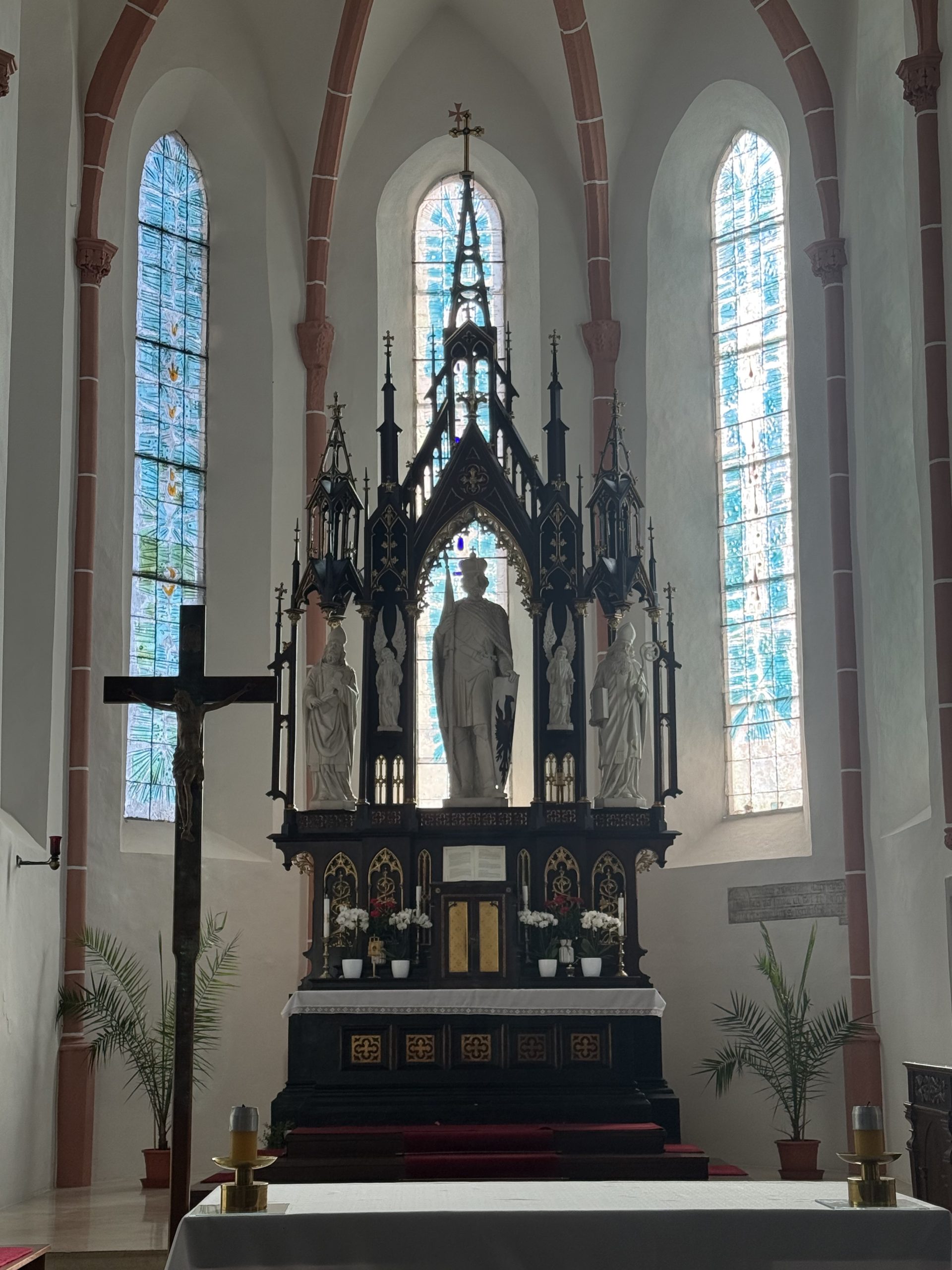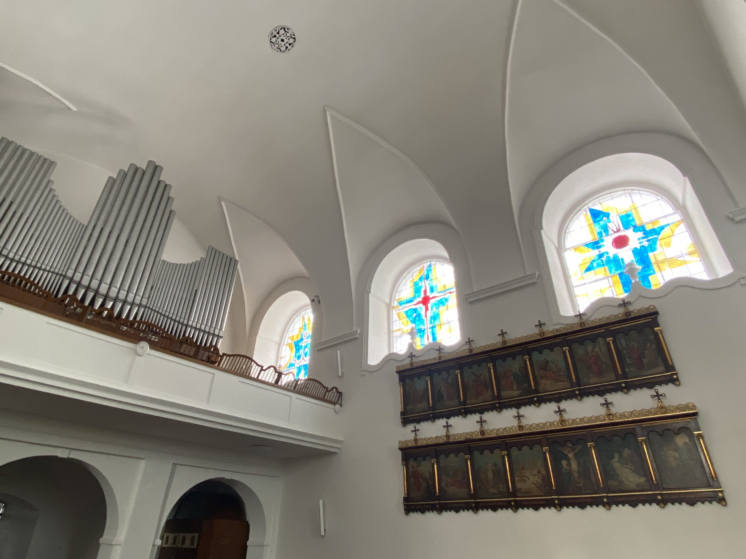 V 70. letech 20. století bylo odkryto románské okénko. V minulosti zde byly vitráže, které byly při bombardování v květnu 1945 zničeny – Křižanov byl bombardován 9.5.1945 v poslední den války. Po opravách v 60. letech byly instalovány nové vitráže od Ludvíka Kolka, které svojí originální barevností přivádějí do kostela mnoho světla – na rozdíl od běžných vitráží, které kostely spíše ztmavují. Ludvík Kolek je autorem i moderního oltáře v boční kapli sv. Michaela.