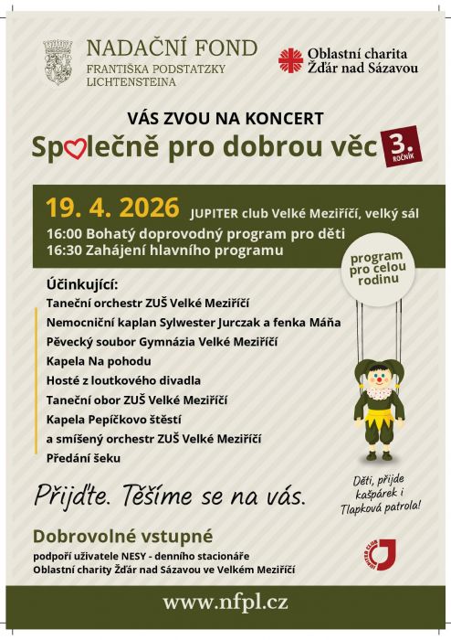Jupiter ClubTřetí ročník charitativního koncertu Nadace Františka Podstatsky Lichtensteina letos nabídne bohatý program pro celou rodinu. Účinkují taneční i pěvecké orchestry z Velkého Meziříčí, těšit se můžete i na účast loutek z místního loutkového divadla. Charitativní podpora bude určena pro denní stacionář NESA z Velkého Meziříčí.