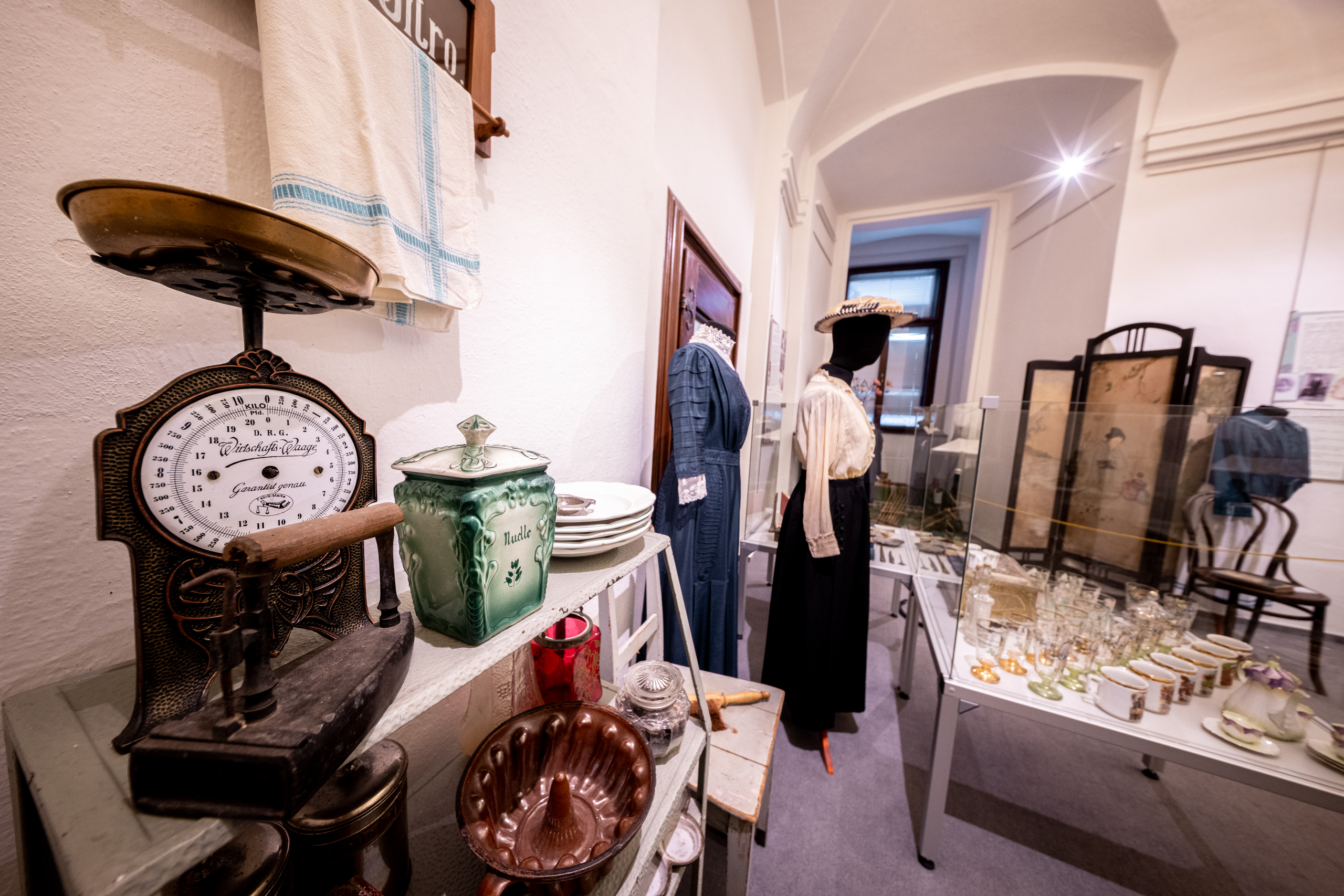Výstava vtáhne návštěvníky také do světa módy, a to díky elegantním šatům, obuvi, kloboukům, rukavičkám, slunečníkům a bižuterii ze soukromých kolekcí Jana Marouška a zlínské sběratelky Zdeňky Mudrákové.